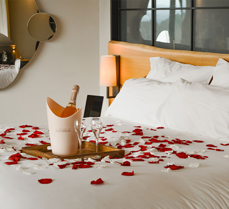 ○ VIP welcome: a bottle of Mirabeau sparkling rosé, sweet treats, and delicate rose petals